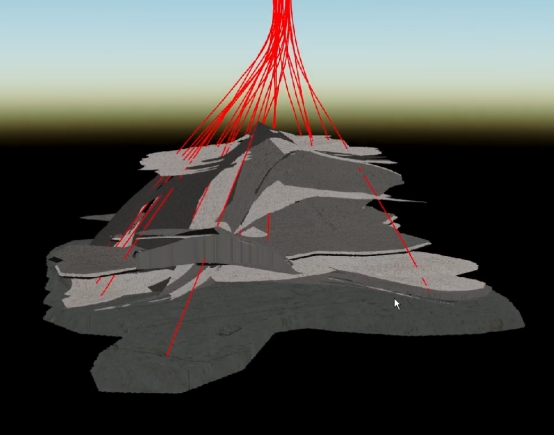 地質體建模基于單井測井數據識別巖層類型,對比鄰井地質展布、孔隙度、導電率等參數繪制二維地質平面,結合半方差算法(分析巖性參數空間相關性)拓展為三維地質體,精準反映地層構造、流體分布及滲透率等關鍵參數。例如,析巖井下孿生平臺通過井口 GPS 定位與井斜數據構建三維井眼軌跡,結合地質素材庫繪制層位軌跡,實現層間互聯與區塊地質展布的可視化。