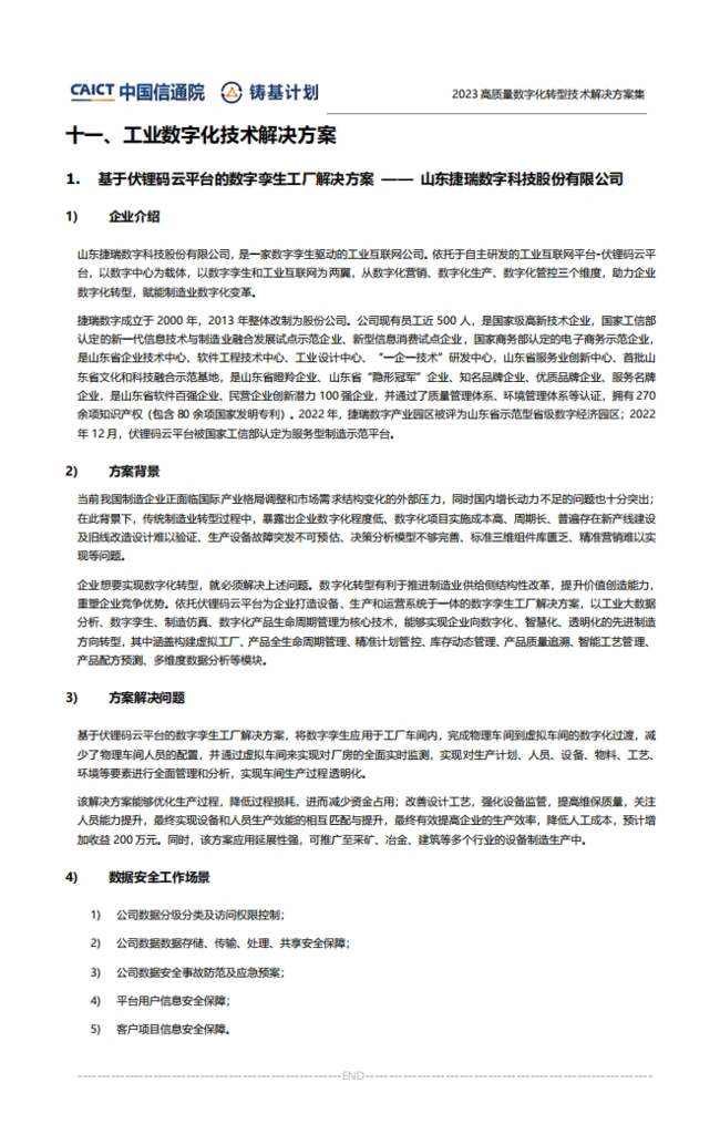 近日,中國信息通信研究院“鑄基計(jì)劃”《2023高質(zhì)量數(shù)字化轉(zhuǎn)型技術(shù)解決方案集(第一版)》(以下簡稱“《方案集》”)正式發(fā)布,遴選出一批具有產(chǎn)業(yè)推廣應(yīng)用效應(yīng)的企業(yè)數(shù)字化轉(zhuǎn)型技術(shù)方案,旨在推動(dòng)數(shù)字經(jīng)濟(jì)時(shí)代社會(huì)生產(chǎn)方式、生活方式及治理方式變革。由捷瑞數(shù)字打造的《基于伏鋰碼云平臺的數(shù)字孿生工廠解決方案》成功入選,為加快企業(yè)數(shù)字化轉(zhuǎn)型進(jìn)程提供了強(qiáng)有力的支持。