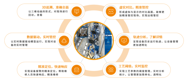 數(shù)字孿生工廠通過對現(xiàn)場設備進行虛擬再現(xiàn),可對設備實時管理與設備報警精準定位,幫助維修人員精準維修,又可呈現(xiàn)設備歷史運行軌跡,從而實現(xiàn)對現(xiàn)場設備的精準管控和優(yōu)化運行。其功能特點主要有: